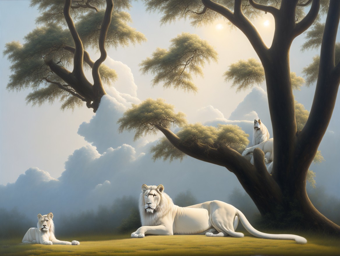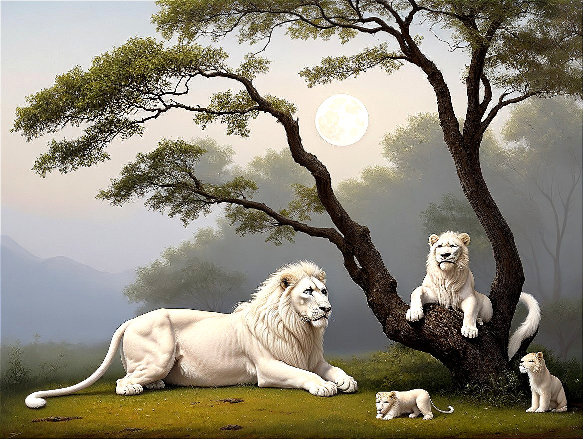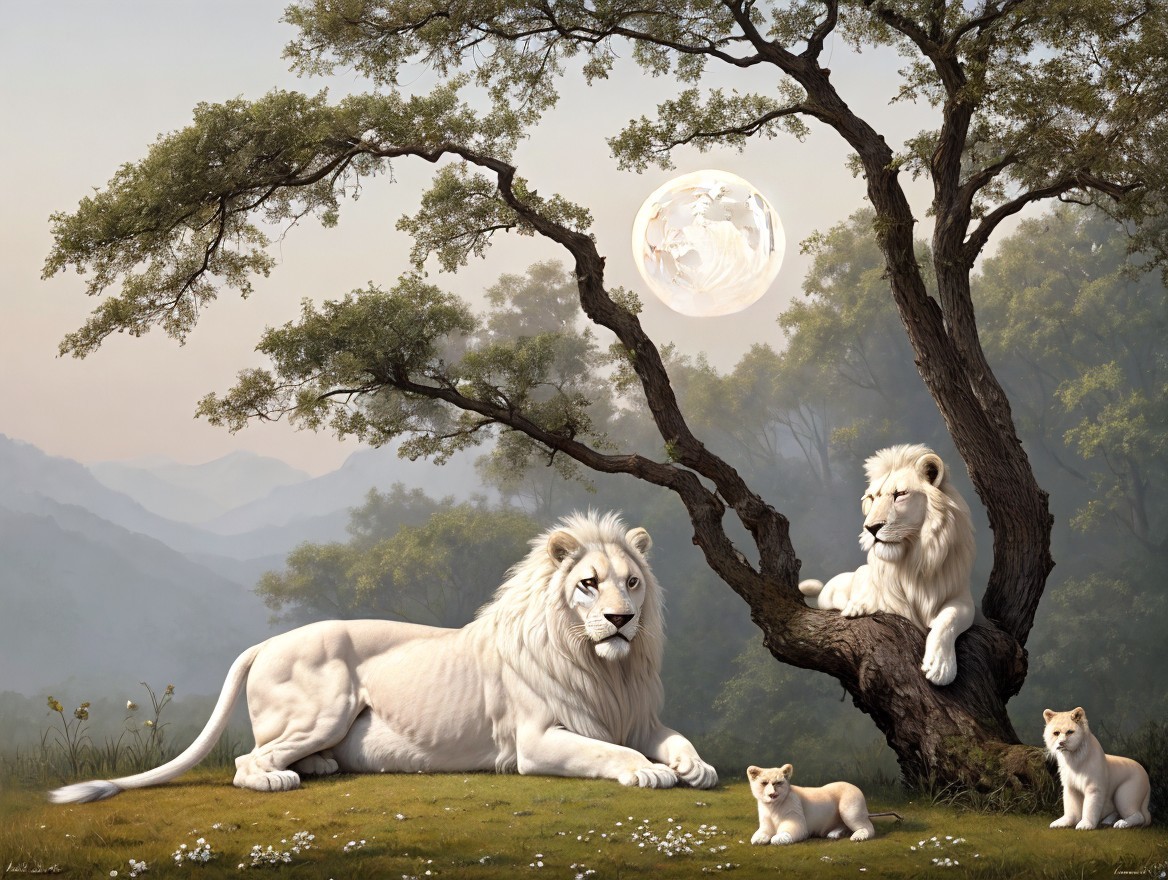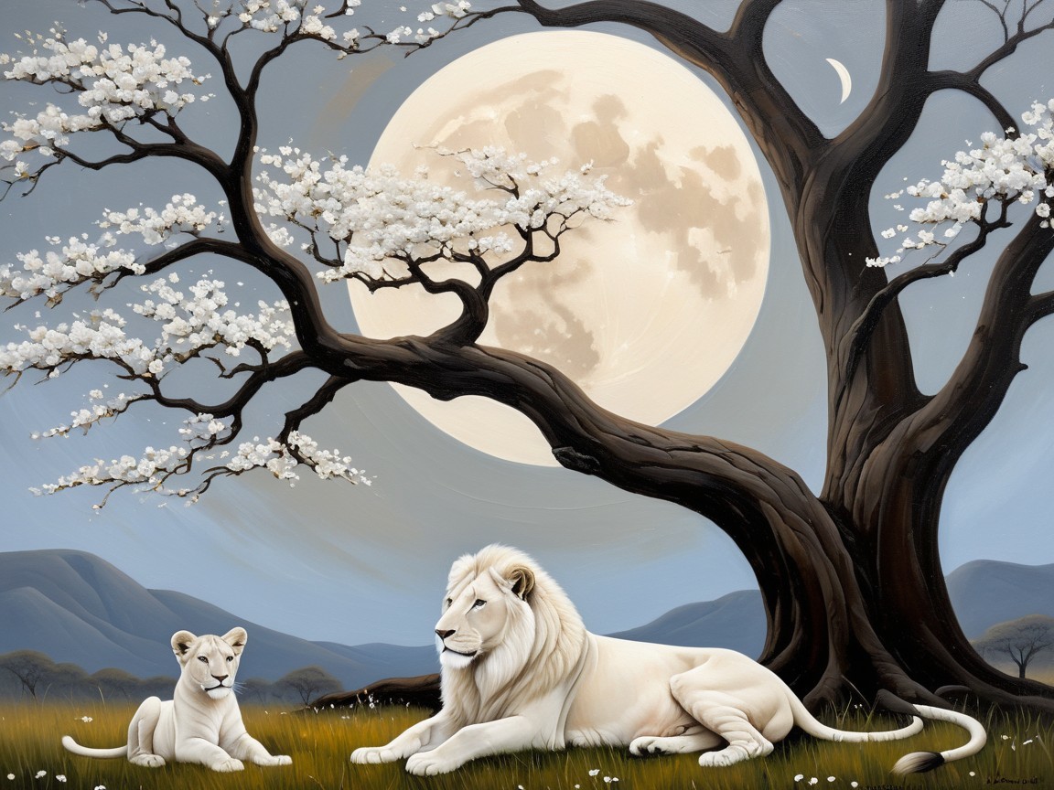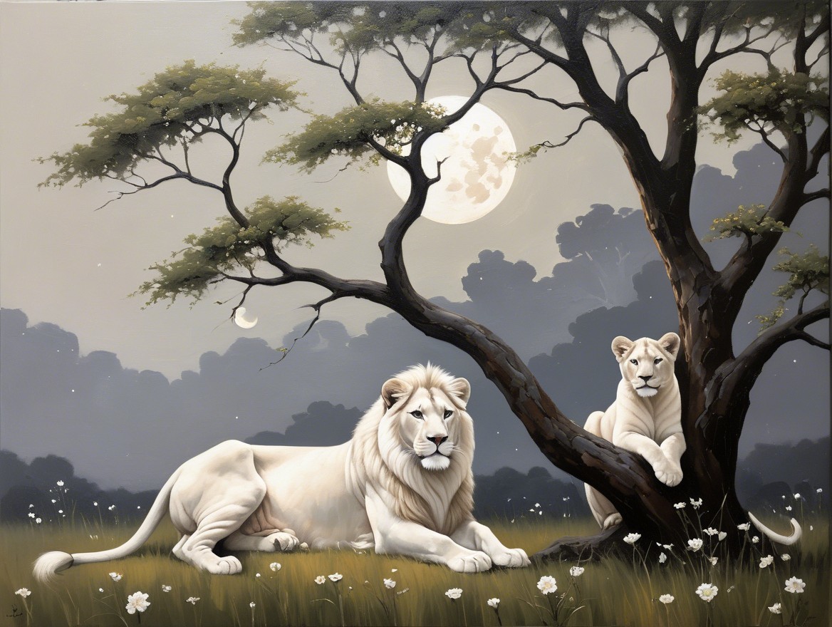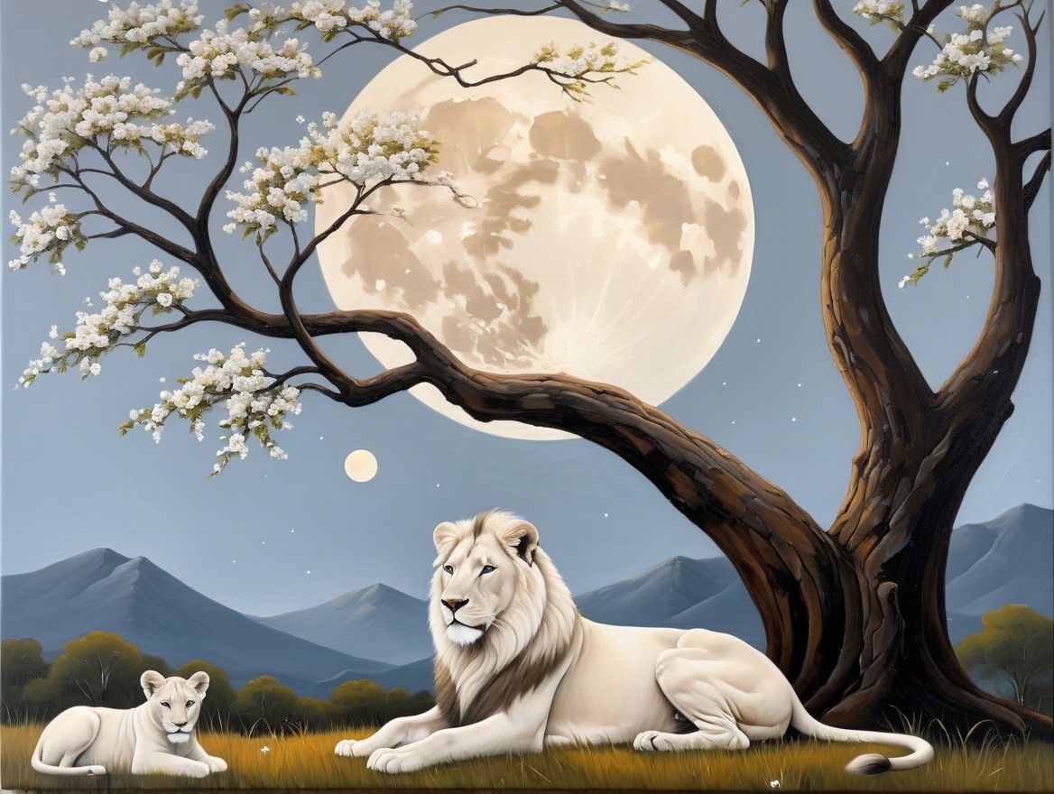 A serene scene features a majestic white lion resting beneath a blooming tree, with vibrant flowers and a moonlit sky creating a tranquil, dreamlike atmosphere.