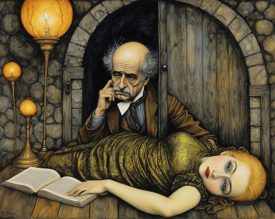 A dramatic, artistic portrayal of a man in period attire leaning over a woman in an elegant golden dress, both immersed in a captivating atmosphere with rich colors and intricate details.