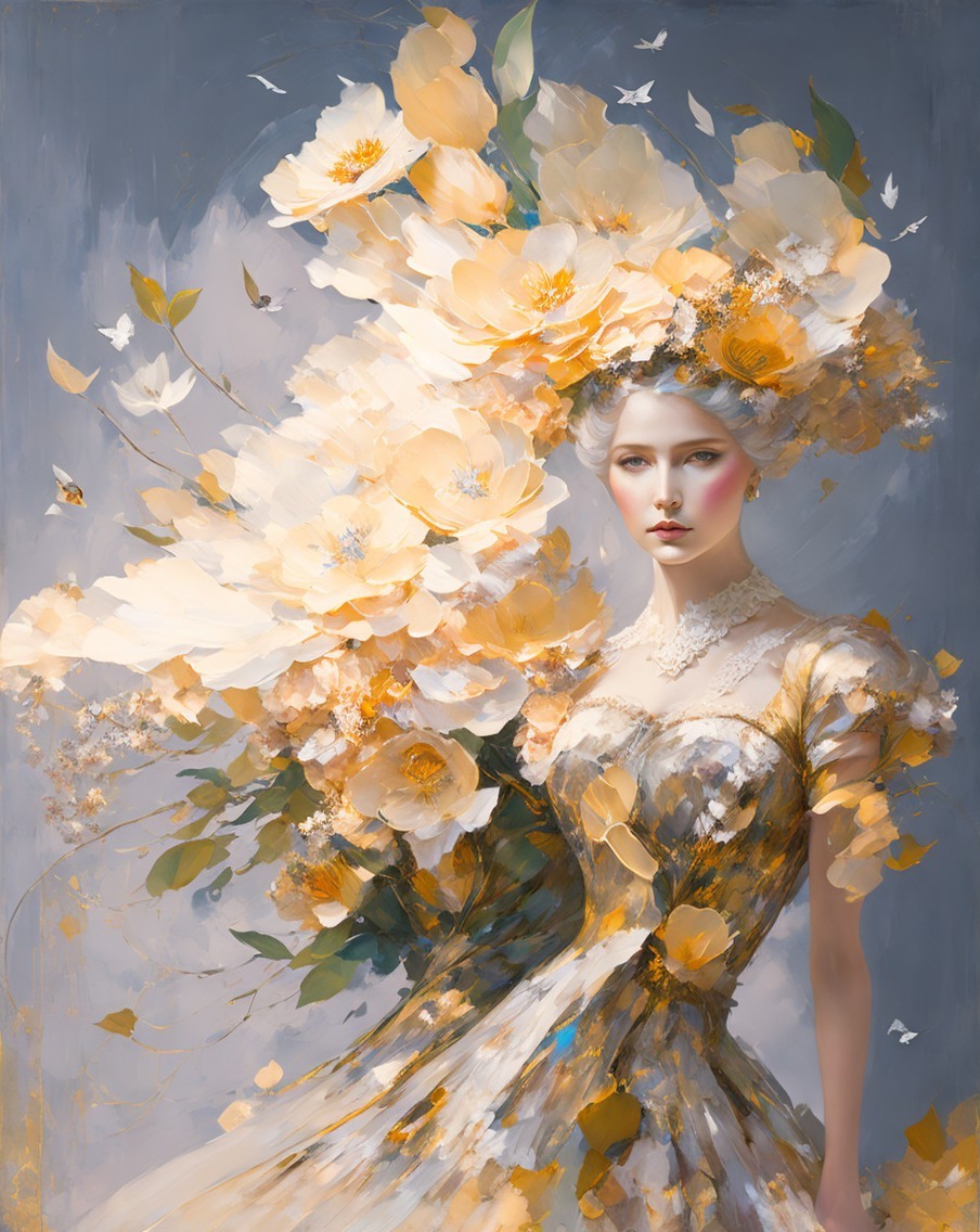 Lovely pretty ephemeral lady, she is a gift Illustration art by Rebeca Saray, Michael Creese, Frank Cadogan Cowper, Yves Saint-Laurent, Thomas Edwin Mostyn, Hiro isono, James Wilson Morrice, Axel Scheffler, Gerhard Richter, pol Ledent. Encaustic paint and volumetric lighting. Mixed media, elegant, intricate, beautiful, award winning, fantastic view, 4K 3D, high definition, hdr, focused, iridescent watercolor and ink