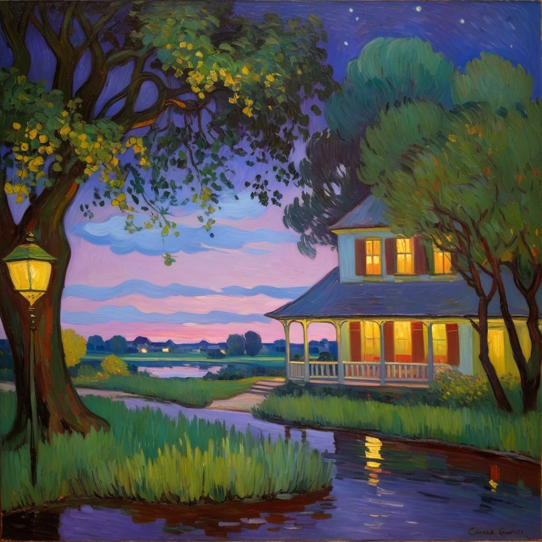 A serene landscape featuring a vibrant yellow house beside a tranquil stream. Lush trees frame the scene, while colorful clouds and a twilight sky create a peaceful atmosphere.