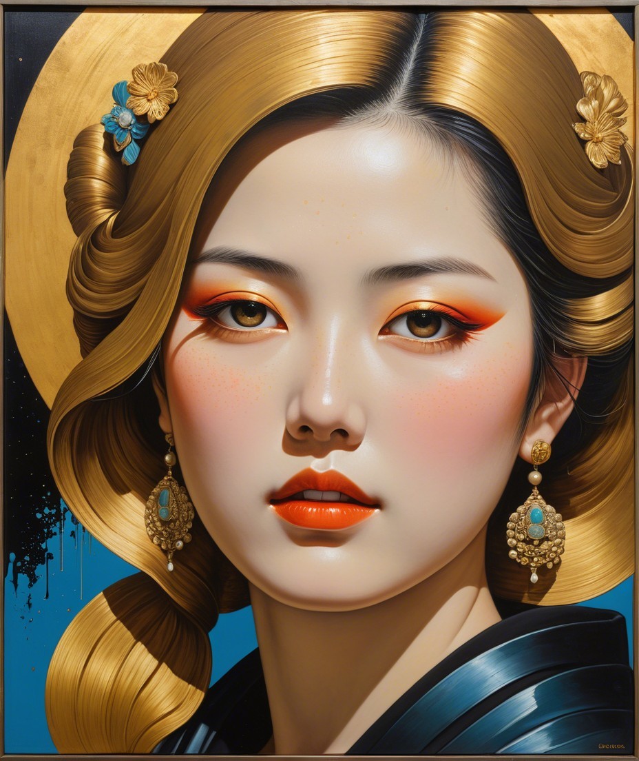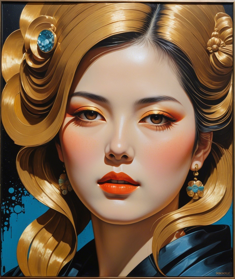 Portraiture, oil on wood, splashed oil painting, renaissance style, embossed foil relief, biolumiscent eyes,auracore, overall composition in Japanese ukiyo-e aesthetics by Overton Loyd, acetate, crisp quality, bold strokes, impasto, illusion and beauty, Tints of 1970s advertising art, hues by Susan Seddon Boulet, anisotropic filtering 1.7, shadow mapping 1.3, dynamic lighting 1.7, 3d effects 1.8,, high coloring, gouache and ink merged, triadic color scheme beige green amber, dimmed lighting, low key lighting, tints of Margaret Keane, linear perspective, stacked-up perspective, stacked lines, hallucinatory, radiance, highly gorgeous plasticity, style of Georgia O'Keeffe and Overton Loyd and david graeme Baker, sculpted, stylized lineage illustration 1.5, subtle coloring 1.9, warm tones, folded paper style 1.6, complexion 1.2, divisionism, quilling, quaint, cel-shaded illustration by david graeme Baker, dramatic lighting from top to centre, grunge, traumacore1.2, coherent, otherworldly, primary colors, stark contrast, luminosity 1.9, brightness 1.9, beautiful composition 1.9, luminosity 1.8