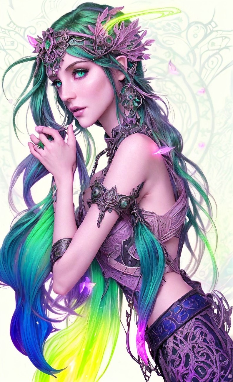 (Elf, female sorceress 5:3), beautifully crafted garments, greenish bioluminescent hair, Mysterious appearance, lovely essence, tints of steampunk, biomorphic shapes, intricate ornamental details, dreamy pinkish glow, triadic color scheme pink green beige, riverine landscape background, embossed flares, finest strokes, maximalism, gothic illustration, Radiance, golden ratio, colorful reflections, psychedelic iridescence, leafs, small dripping sparks