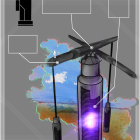 The image depicts a futuristic structure resembling a tower with a rotating top, featuring cylindrical sections and glowing elements. It is set against a stylized map-like background.