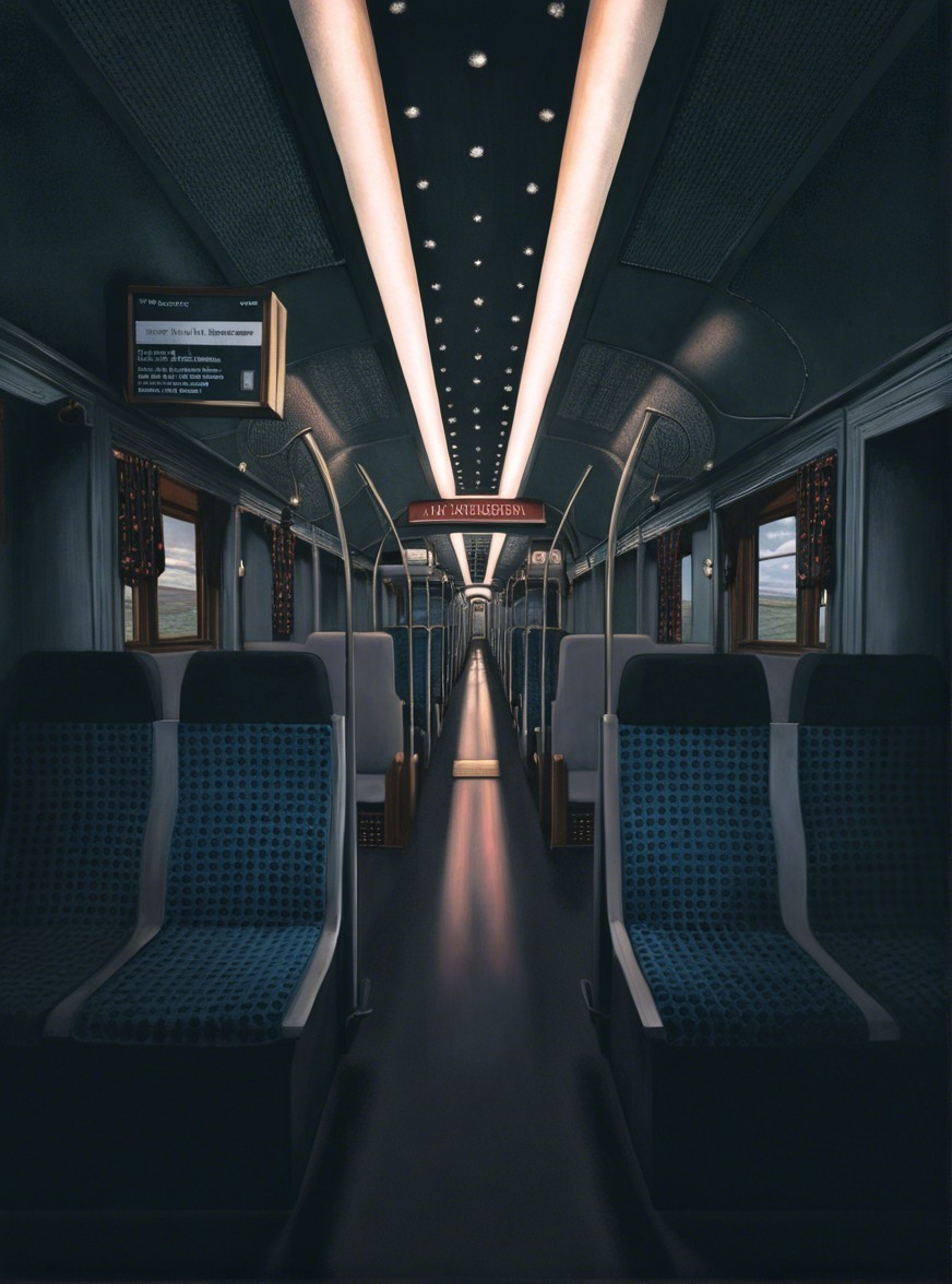 A dimly lit train carriage features rows of empty, gray seats. At the far end, a lone figure stands before an illuminated doorway, evoking a sense of solitude and anticipation.