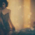 A softly lit scene captures a woman in a delicate, flowing dress. She stands thoughtfully, creating an intimate atmosphere with warm, blurred tones and gentle shadows.