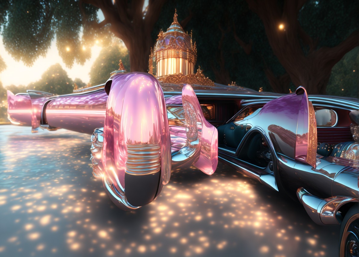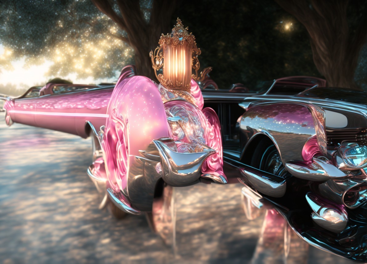 Vintage pink car with ornate lantern, parked under trees at sunset