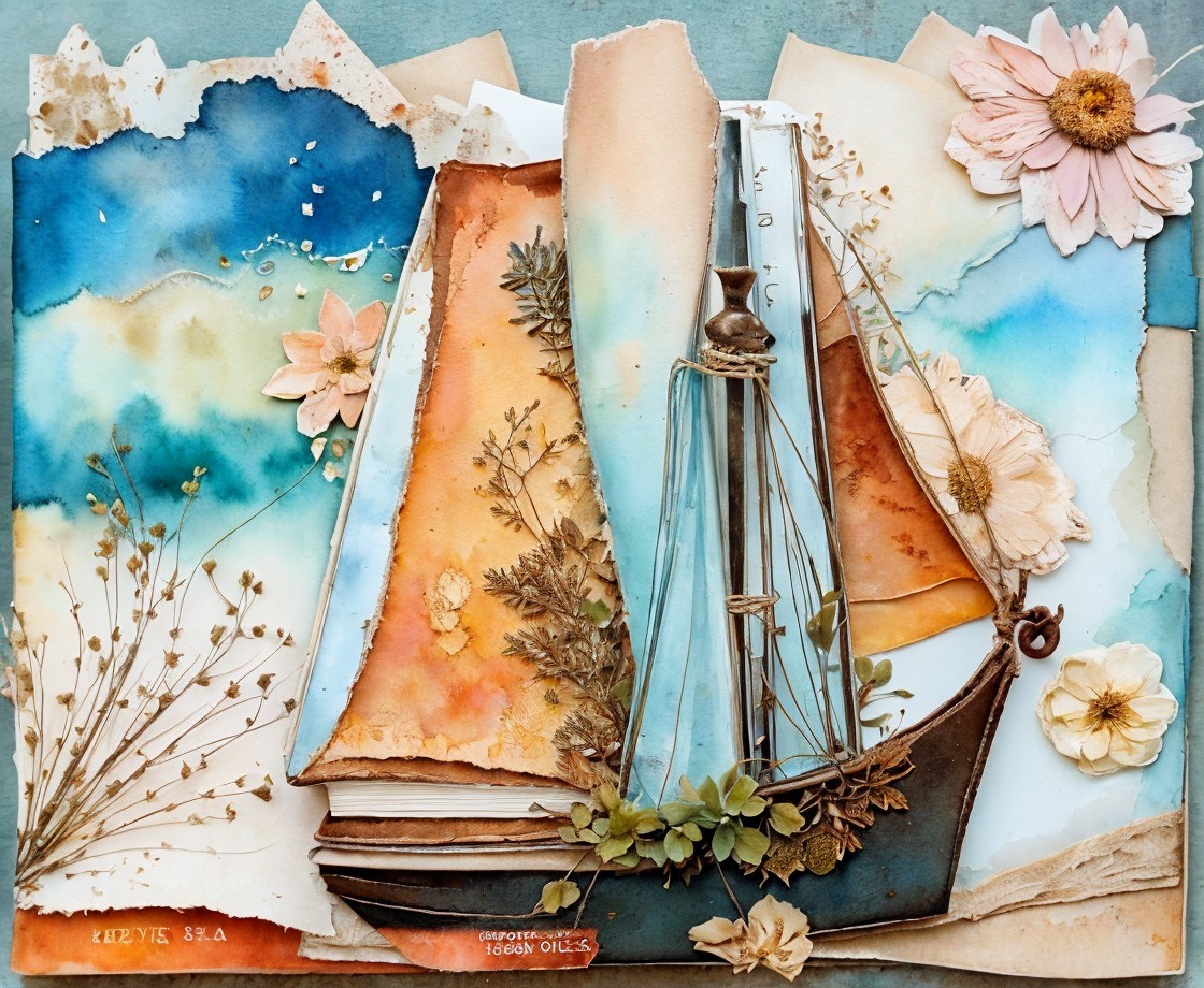 A creative flat lay featuring a spiral-bound notebook layered with watercolored papers, vintage pages, dried flowers, and a delicate pink blossom, all arranged on a textured background.
