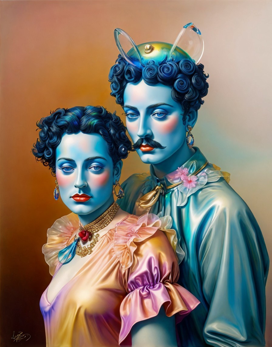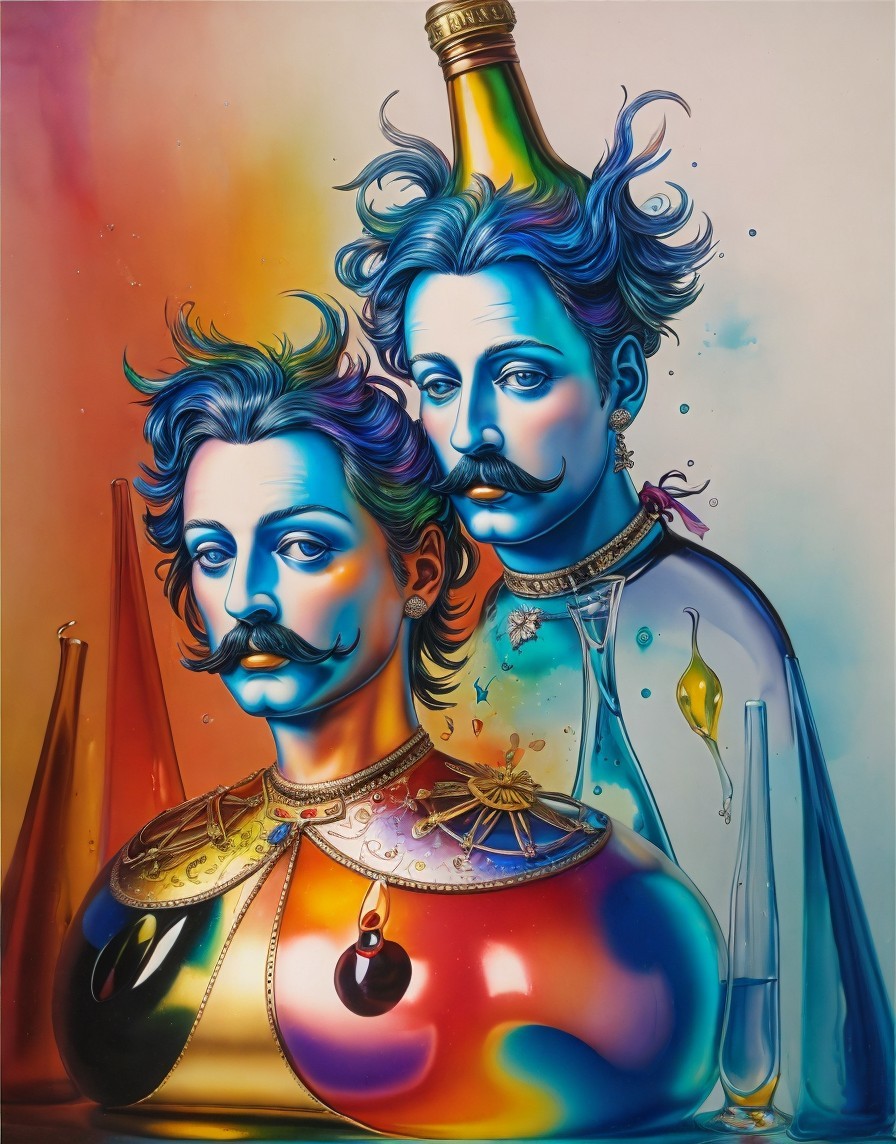 Colorful surreal portrait of figures with flask heads and regal attire.