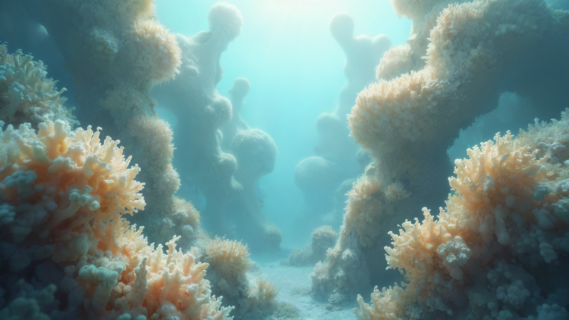 This surreal image showcases intricate, organic shapes inspired by marine life, blending soft blues, whites, and earthy tones. Its symmetrical design and fluid quality create a mystical underwater exploration feel.