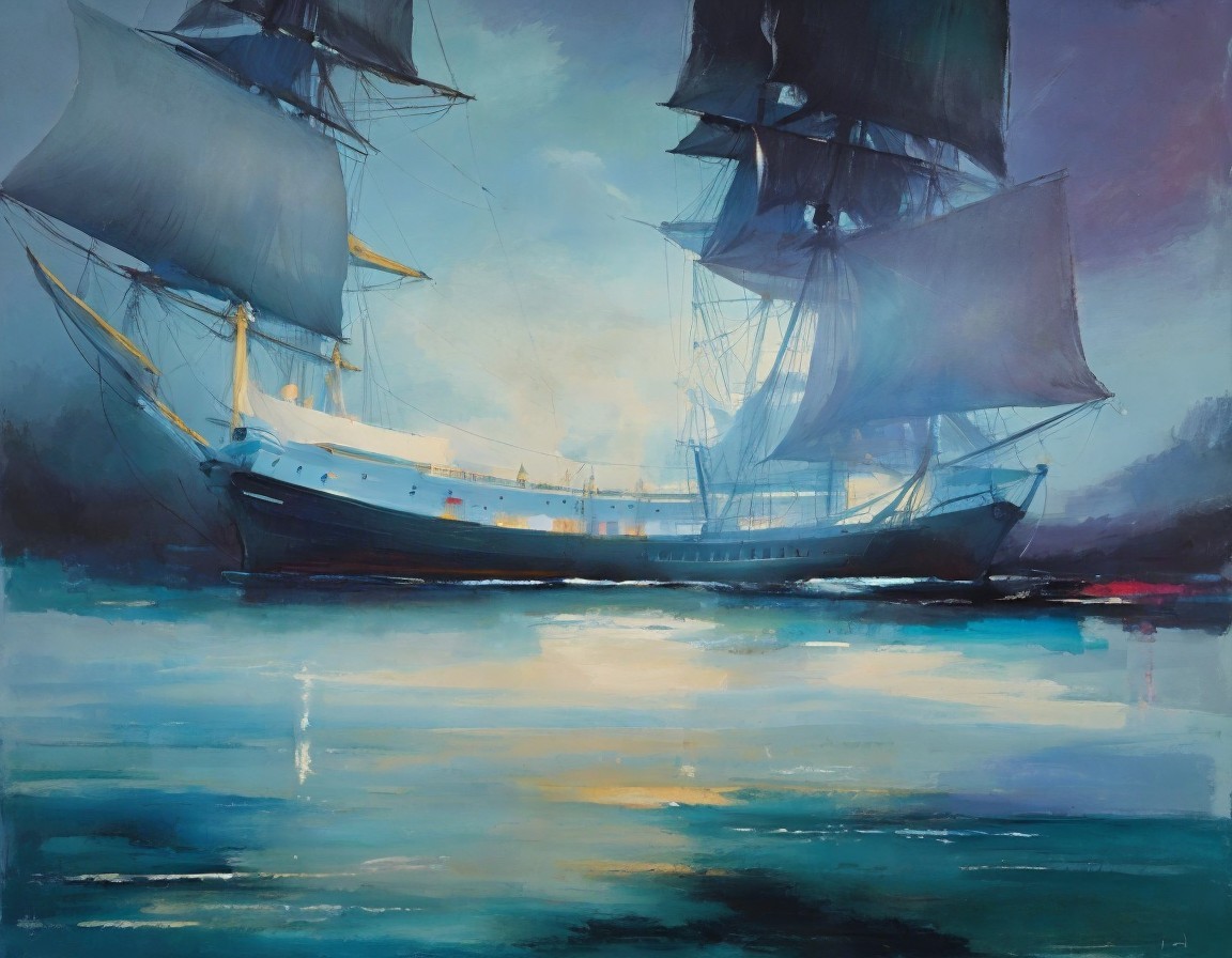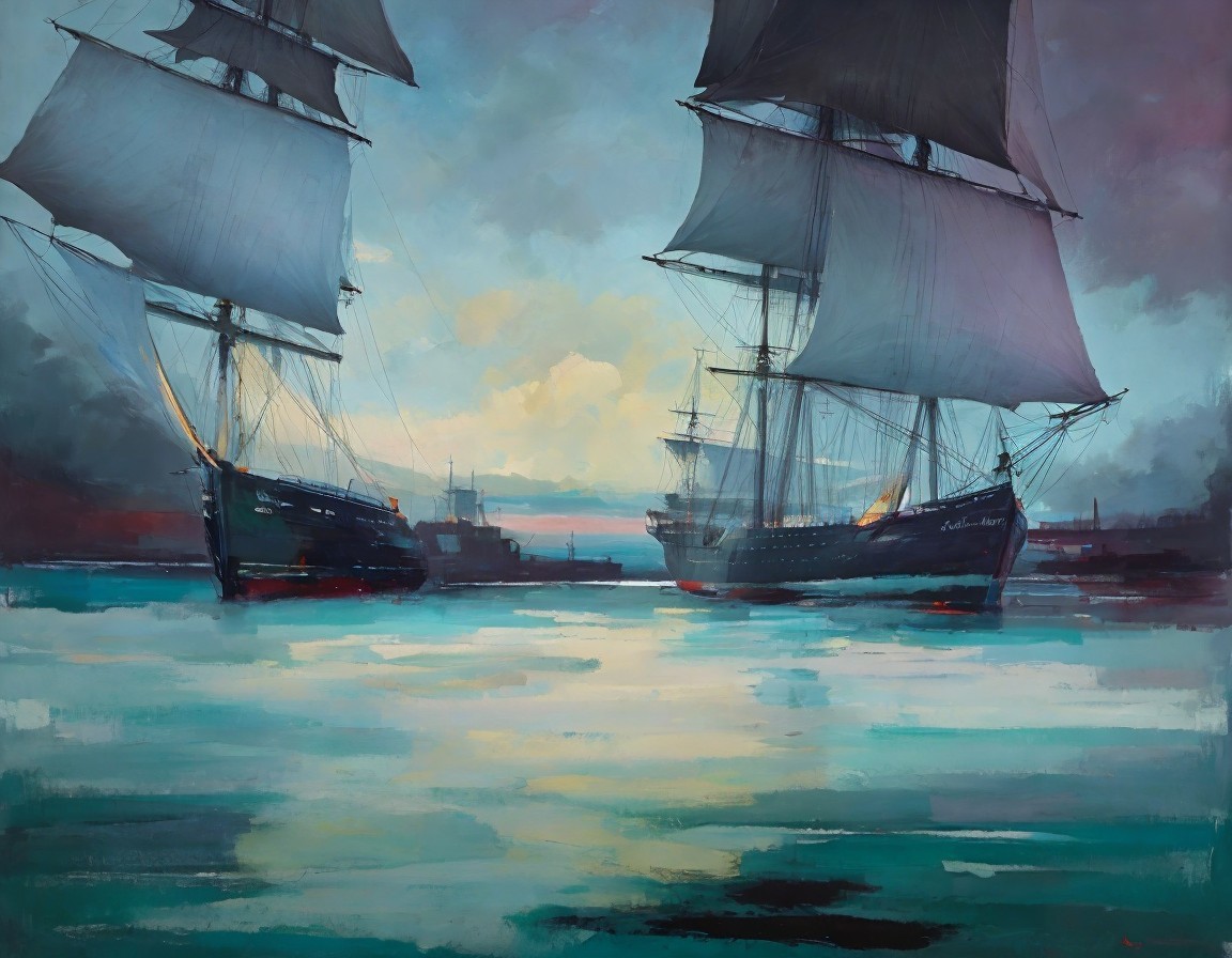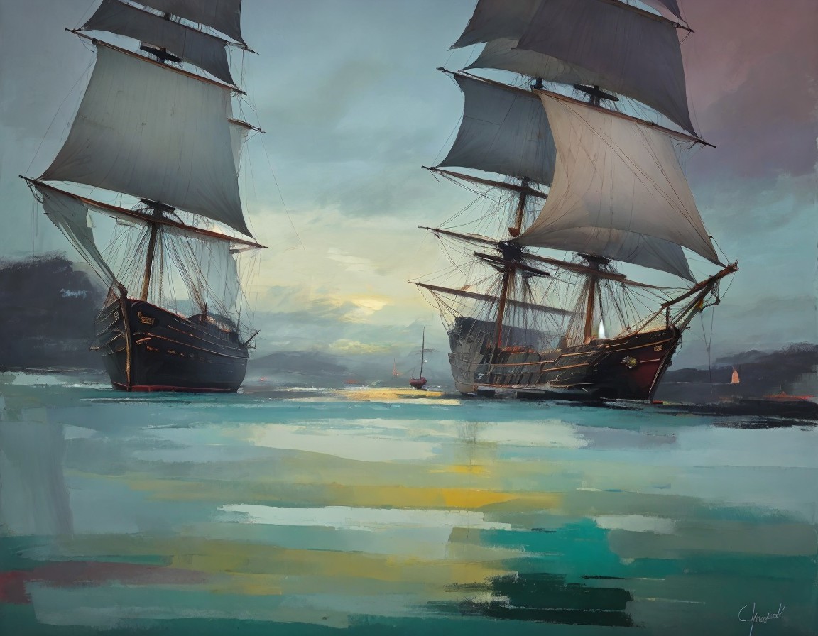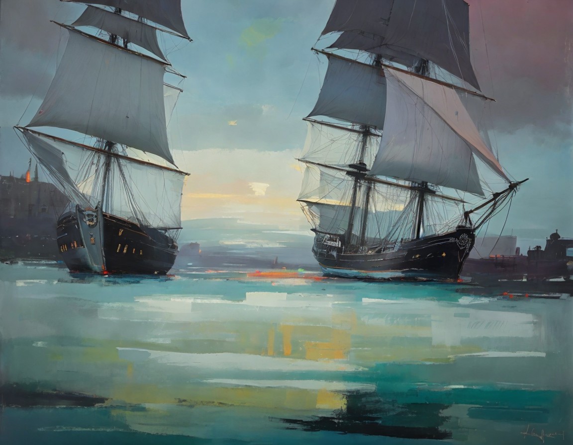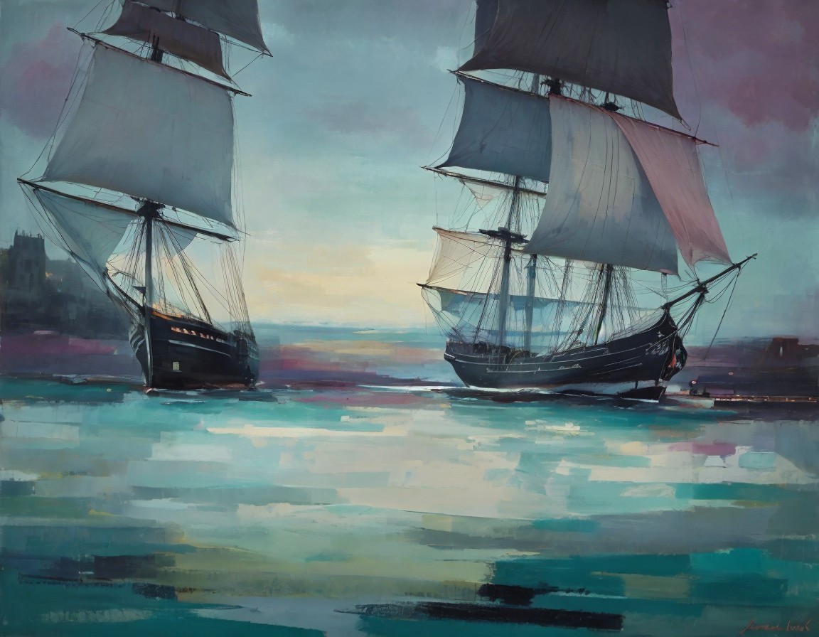 Two tall ships with full sails navigate serene waters with a soft-hued sky and distant cityscape.