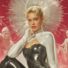 A model poses against a pink backdrop, wearing a shiny black corset and a flowing white cape. Adorned with a floral crown and a radiant halo, she exudes elegance and modernity.