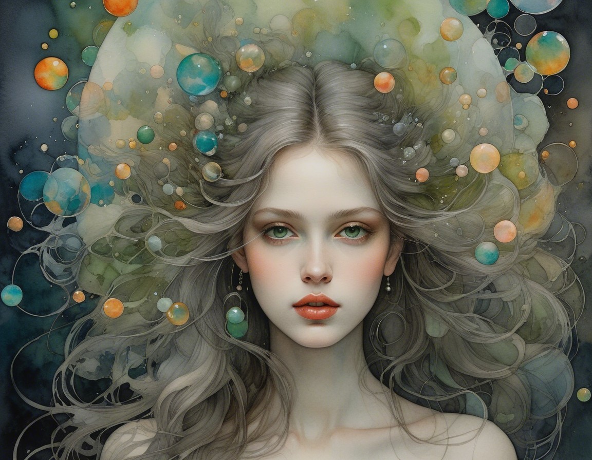 Prompt: Enhance bubbles. watercolor delicate sobriety fine lines in shades of gray and green watercolor and ink by Anton Mauve and Enki Bilal. Iridescent watercolor and ink By Jamie Heiden, Daniel Merriam, Paul Klee, Karol Bak, Dee Nickerson, extremely detailed, high definition, crisp quality, ultra detailed background . Close up, ghostly amused beautiful Amazonian goddess in a jungle dreamscape in the style of Alexander Jansson. by Catrin Welz-Stein, Michael Parkes 3d, extremely detailed, beautiful, watercolor and ink, mixed media, Best quality, Very high definition, super clear resolution, cinematic, intricate, fantastic view, beautiful, dynamic lighting, high definition, hdr *Random prompt award winning Max Ernst ultra detailed, 4K 3D Ochre Modifiers: Steve Hanks Ella du Cane Illustration By Marguerite Delorme, by Chokha, by Marguerite Zorach Klimt, Egon Schiele, mucha, Georgia o’keefe