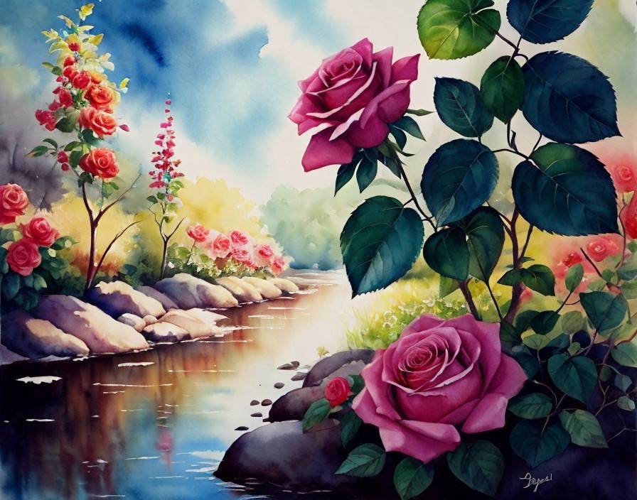 A vibrant watercolor painting of roses in various shades of pink beside a serene pond with a soft, blurry background.