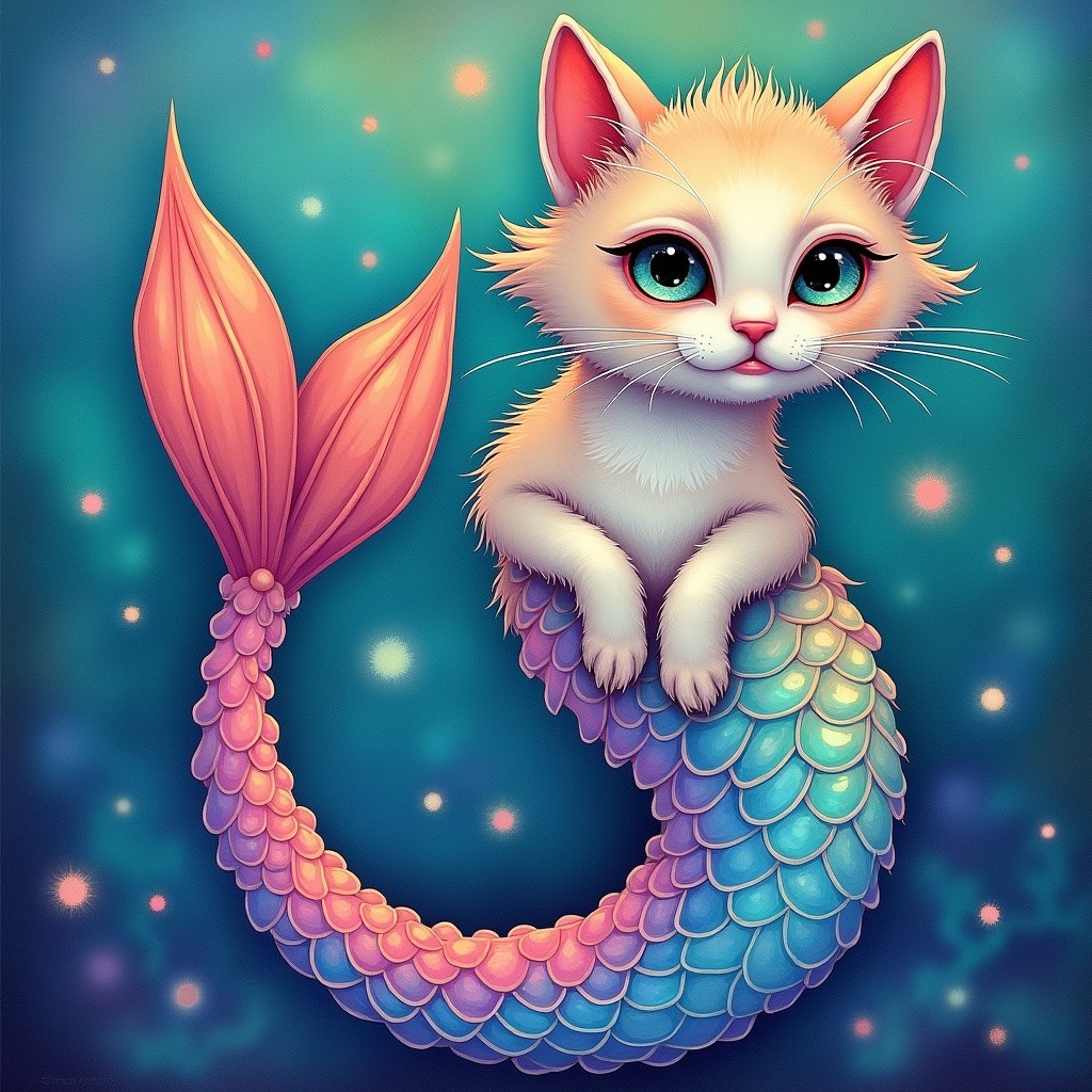 A captivating image of a cat mermaid showcases an elegant tail, blending vibrant and pastel colors in an enchanting fantasy scene. The artwork exudes whimsy and sophistication, creating a mystical atmosphere.