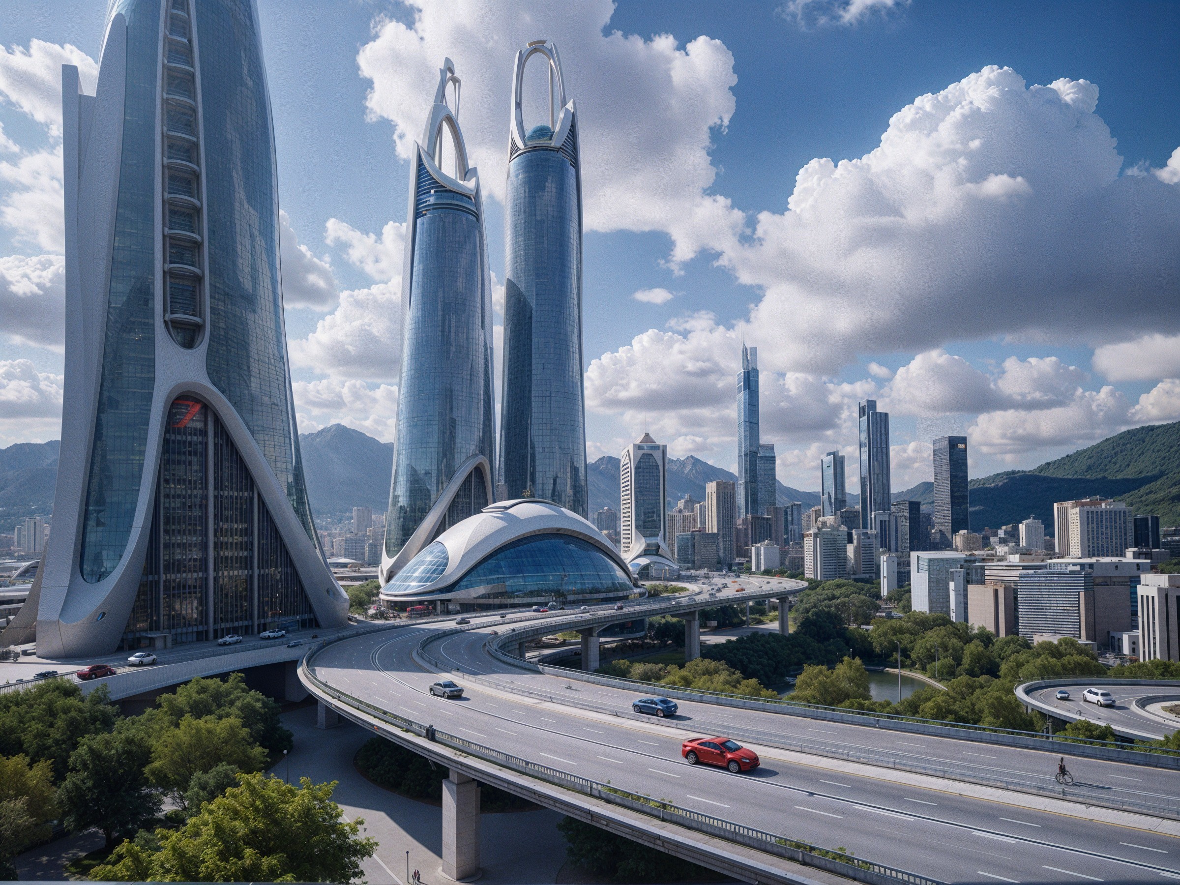 A futuristic cityscape features sleek, glass skyscrapers intertwined with green terraces and elevated walkways, all under a bright blue sky dotted with fluffy clouds, blending nature and technology.
