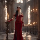 A woman in a sophisticated red velvet gown stands elegantly in a grand, dimly lit cathedral. The dress features intricate lace details and a daring slit, surrounded by flickering candles and stained glass.