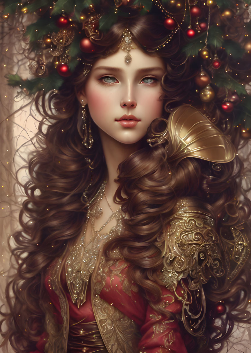 Prompt: A pencil and charcoal line sketch portrait of a beautiful young woman, Christmas fantasy clothes, messy hairstyle, intricate details and precisely drawn cross-hatching lines throughout the drawing, bold lines