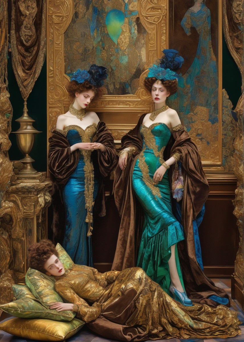 + Prompt:Art deco with 3d detail and golden foil, double image, Egon Schiele painting a two different rococo ladies in chocolate brown Court Room with pillows iridescent blue and green, dynamic poses, silk iridescent texture in watercolor and ink, vibrant colors with gold foil detail, by William Holman Hunt, Tomasz Sętowski, Enki Bilal, Vladimir Fedotko, Pietro Annigoni, Milo Manara, Botticelli, Catrin Welz-Stein, Jean Metzinger, Klimt, perfect eyes, perfect face,