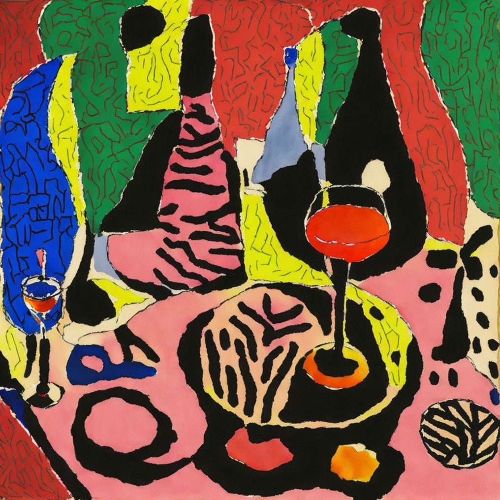 A birthday scene turned into pure groove: curved lines dance around candles, cakes, and glasses until they become playful signs. Color fields pulse with warm energy, reshaping the celebration into a bold abstract rhythm where joy syncs with form.