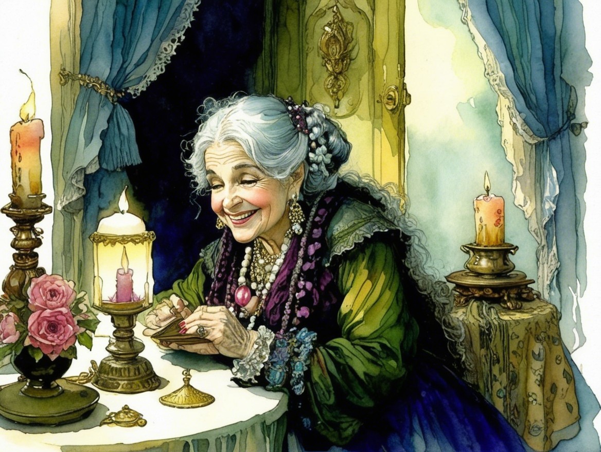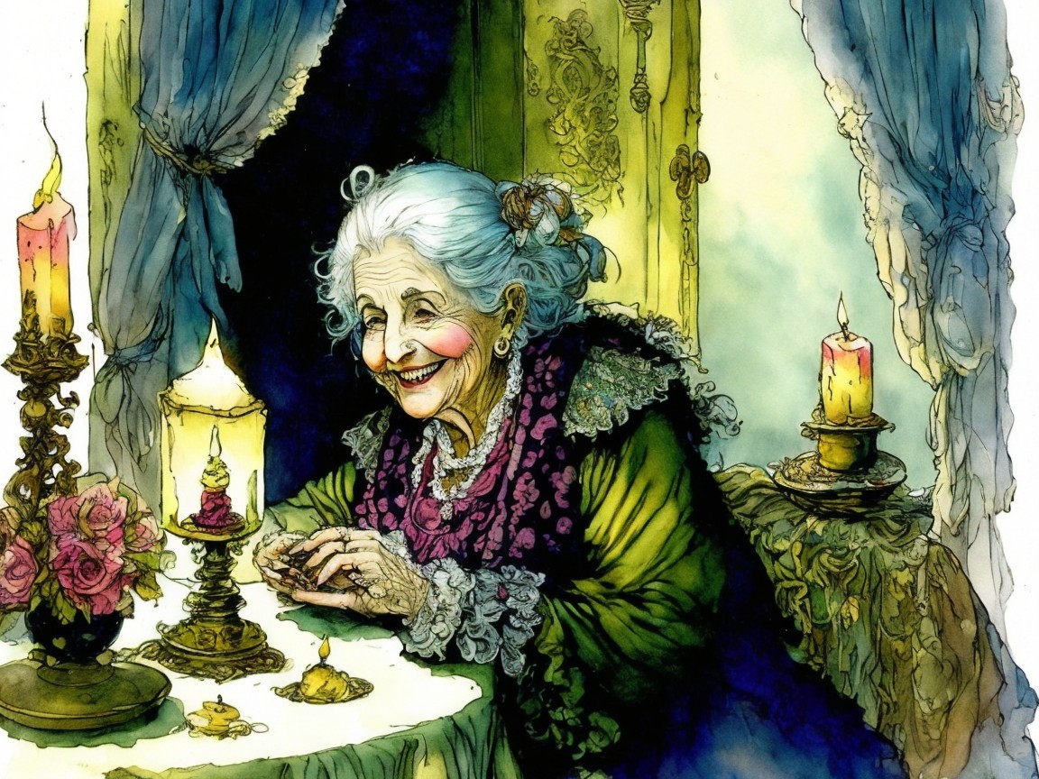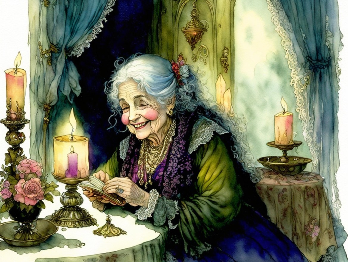 An elderly woman with silver hair, adorned in colorful clothing, gazes intently at tarot cards. Candles flicker beside her, casting soft light in a cozy, mystical room filled with curiosities.
