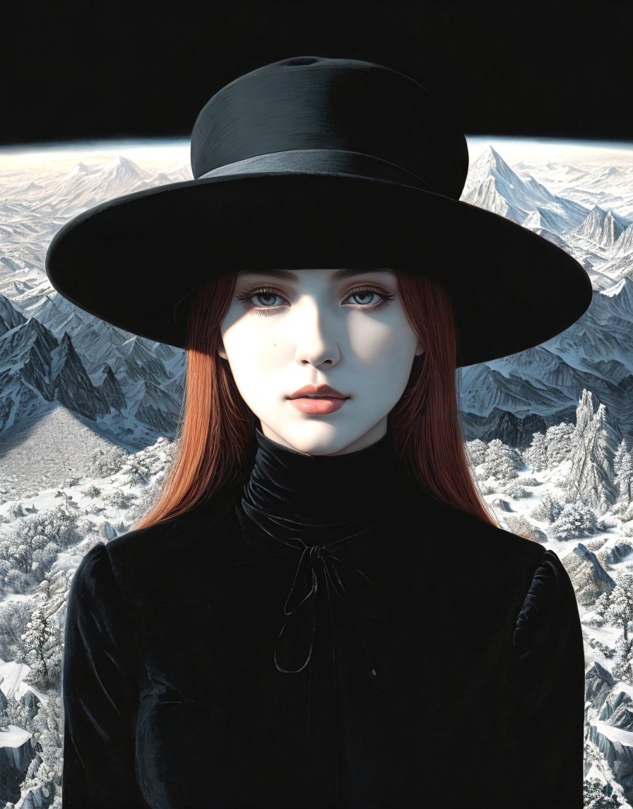A woman in a black outfit and wide-brimmed hat against a mountainous backdrop.