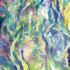 The painting depicts a serene figure with a greenish hue, holding a red heart-shaped flower. Surrounding her are vibrant, abstract colors, creating a dreamy and emotional atmosphere.