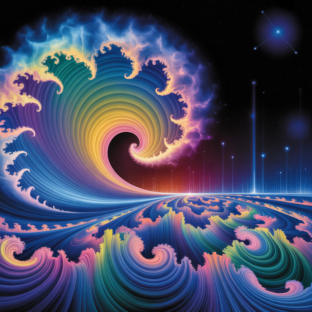 A vibrant, swirling wave of colors cascades through a cosmic landscape. Bright hues blend seamlessly, creating a mesmerizing, fractal-like scene against a starry night sky.
