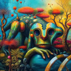 A vibrant, surreal landscape features a colorful, frog-like creature with large, expressive eyes. It rests on a globe amidst whimsical, oversized flora and glowing orbs, creating a fantastical scene.