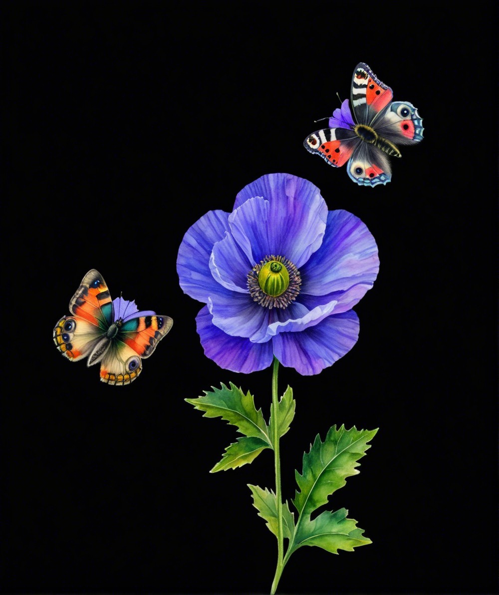 A vibrant blue poppy flower is depicted against a black background, accompanied by two colorful butterflies in shades of red, orange, and green, adding a touch of nature's beauty.