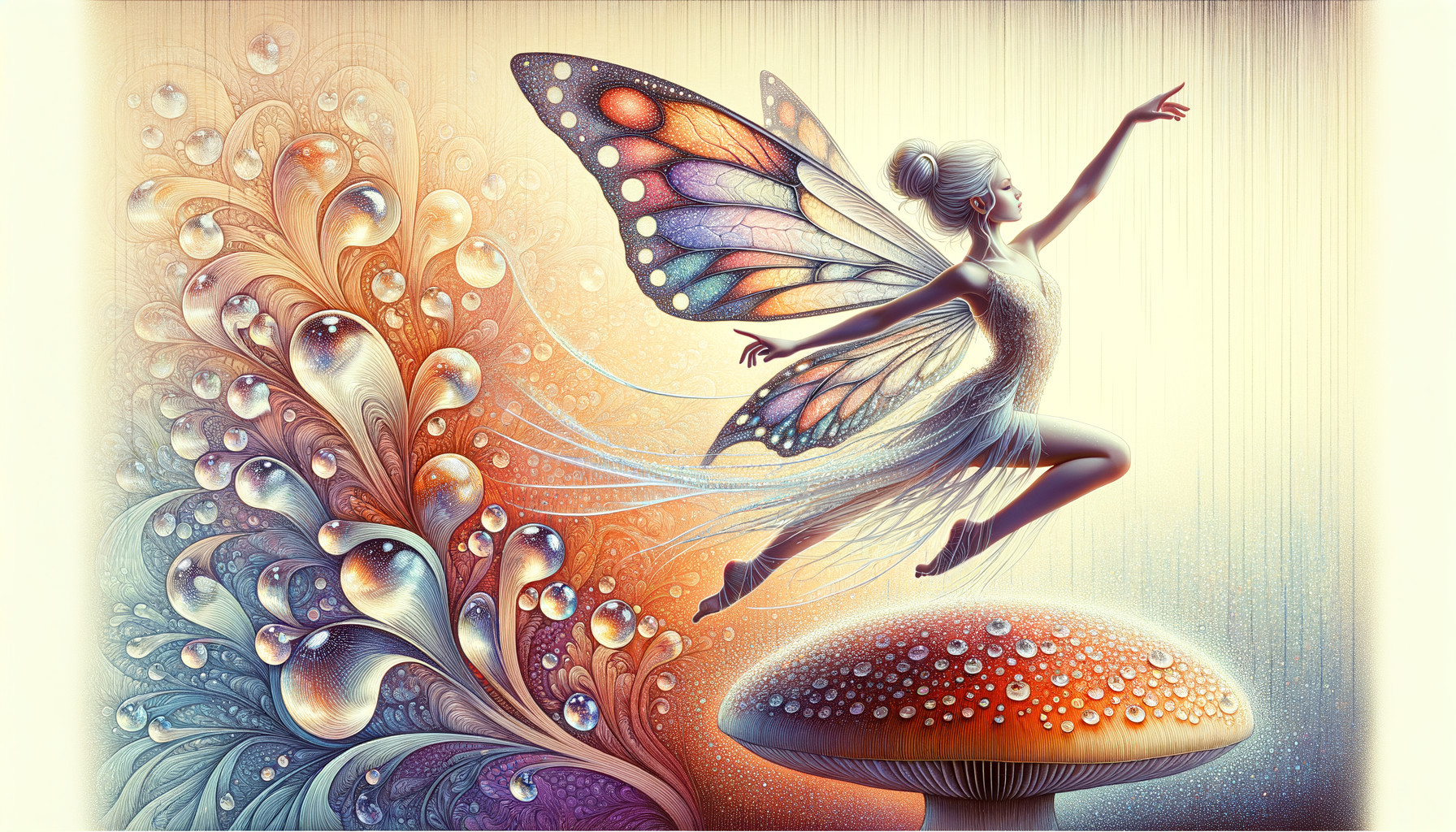 A whimsical illustration of a fairy with iridescent wings dancing above a mushroom amidst water droplets and light rays.