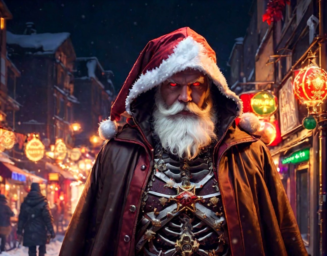 Prompt: "dark futuristic Christmas skeleton cyberpunk skeleton Santa Claus, white beard, with a red cloak with intricate glowing gold details, busy narrow alley, signs for businesses, street food vendors, steam, night, darkness, top view"