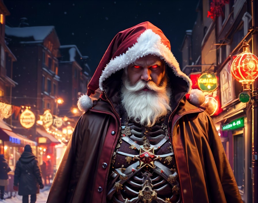 Prompt: dark futuristic Christmas skeleton cyberpunk skeleton Santa Claus, white beard, with a red cloak with intricate glowing gold details, busy narrow alley, signs for businesses, street food vendors, steam, night, darkness, top view