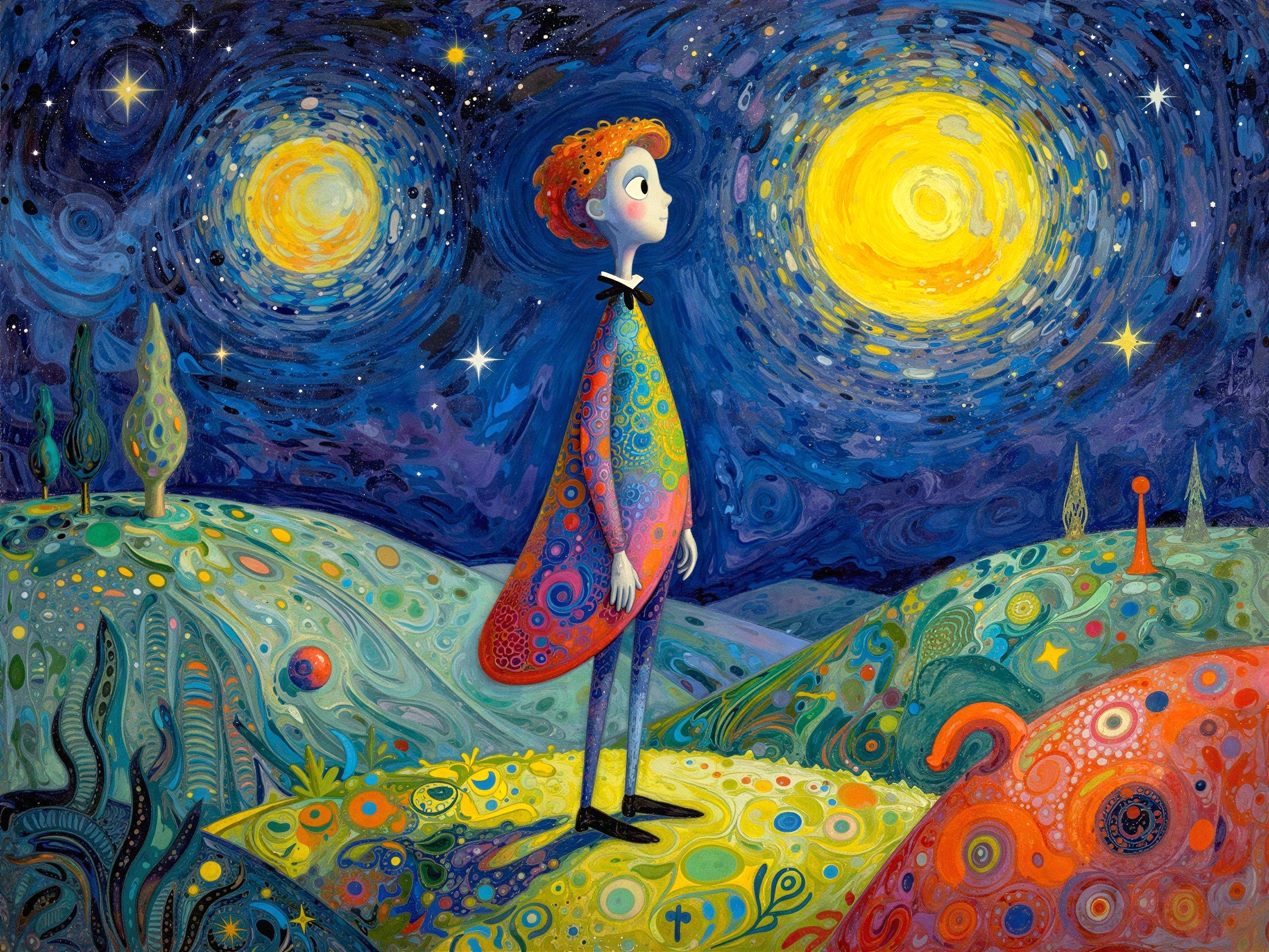 Prompt: (A masterpiece of unparalleled excellence), (("A stylized and abstract colorful Kappa stand on a textured landscape under a starry night sky. A bright yellow sun and scattered stars illuminate the scene, creating a whimsical cosmic atmosphere". Side view, Complex stipple texture, Abstract expressionism surrealism, Pop art)), Inspired by the style illustrations of Edward Gorey, Tim Burton and Tomasz Setowski, Use stunning color oil drawing on textured paper, As if created By Paul Klee, Tim Burton, Tomasz Setowski, Kris Kuksi, Niki de saint phalle, Antoni Gaudí, Dee Nickerson and Jacek Yerka. (Full Size image).
