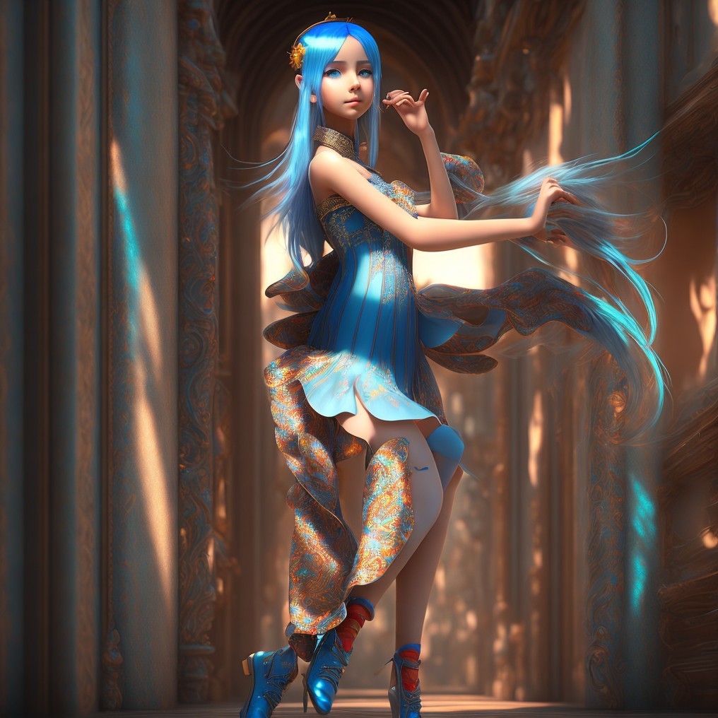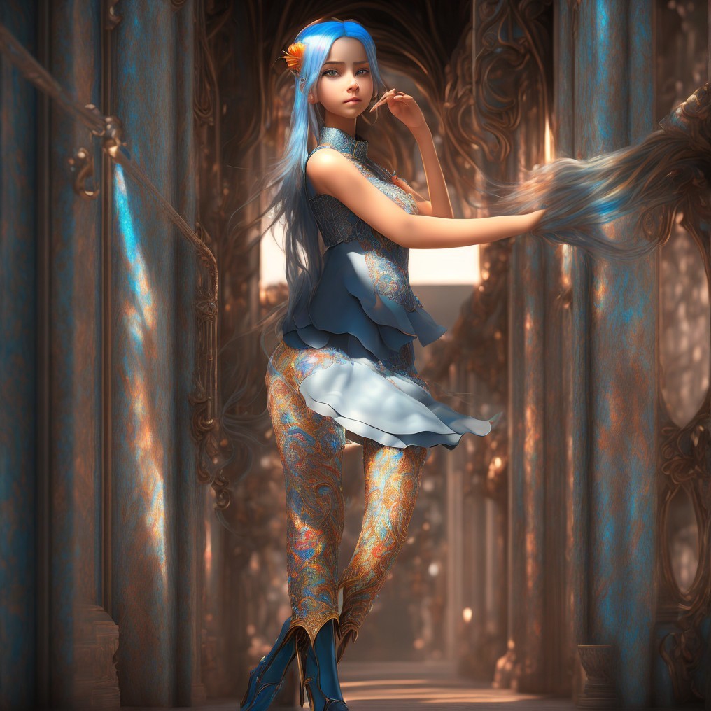 Colorful 3d realistic front view portrait of beautiful young teen girl with blue hair and long legs dancing
