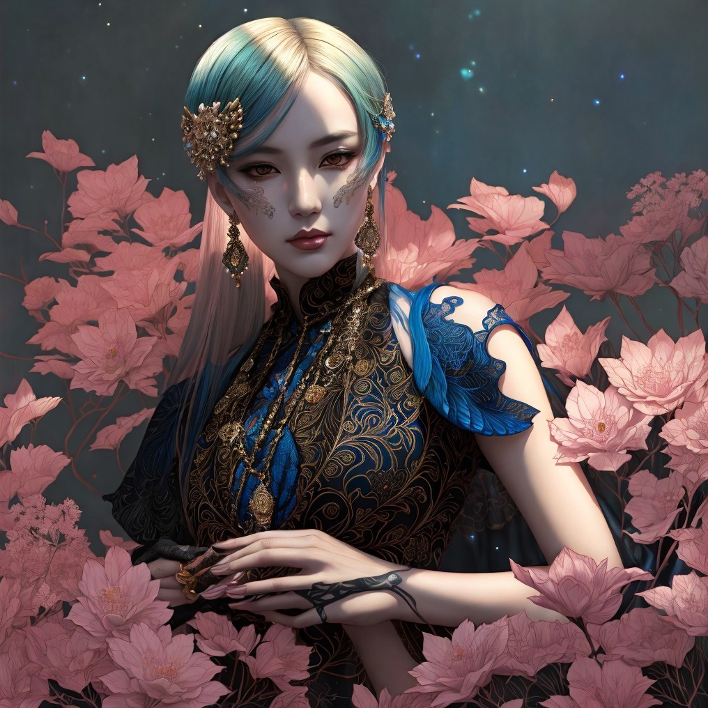 + Prompt:high contrast, intricate patterns, dramatic lighting, Takato Yamamoto inspired ink work, Laurel Burch inspired vivid colors, digital painting.opulence, lavish and glamorous gleam and shimmer, bewitching, magnificent, fantastical, mystical, magical, luxurious and sparkling blue and cadet radiance, masterpiece, high fantasy