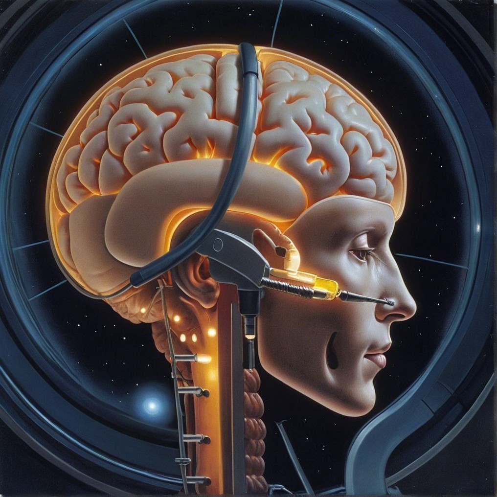 A futuristic depiction of a figure with a translucent, illuminated brain connected to intricate circuitry, blending human features with advanced technology in a dramatic, dark setting.