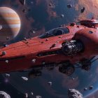 A sleek, red spaceship glides through an asteroid field, with the majestic planet Jupiter looming in the background. The scene evokes a sense of adventure in deep space. This is actually the second version of this image. I prefer the first but something went wrong and there does not seem to be any way to back up to that version. So here we have it.