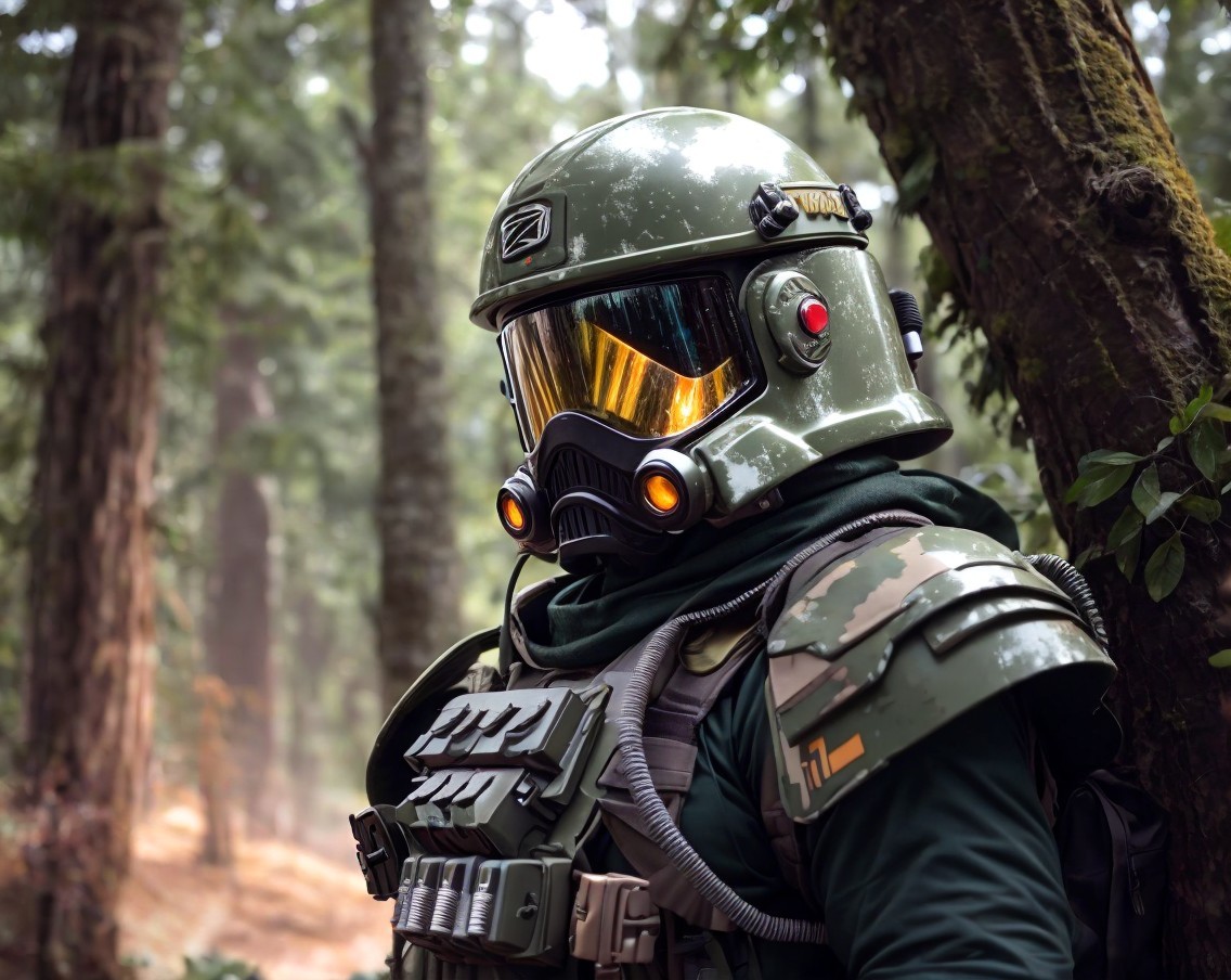 Detailed Green Military-Style Helmet with Golden Visor in Forest Setting