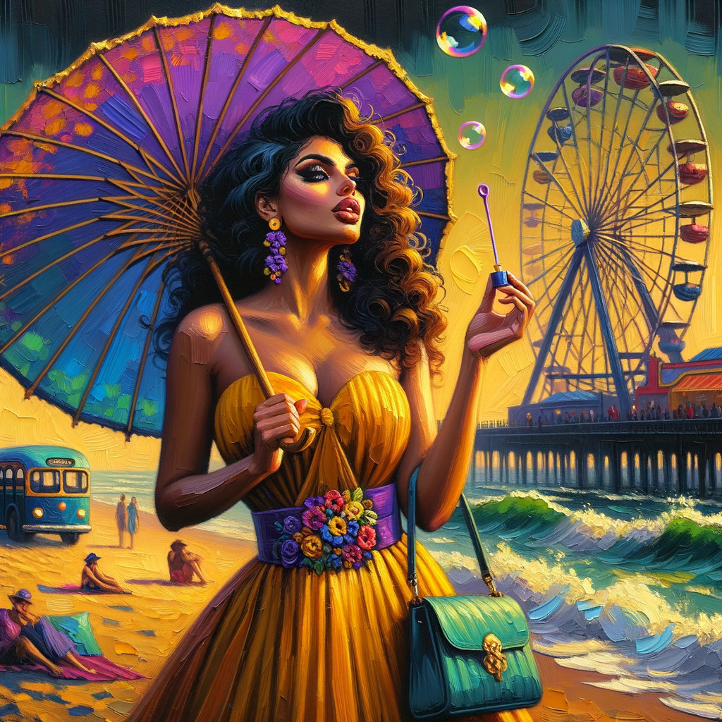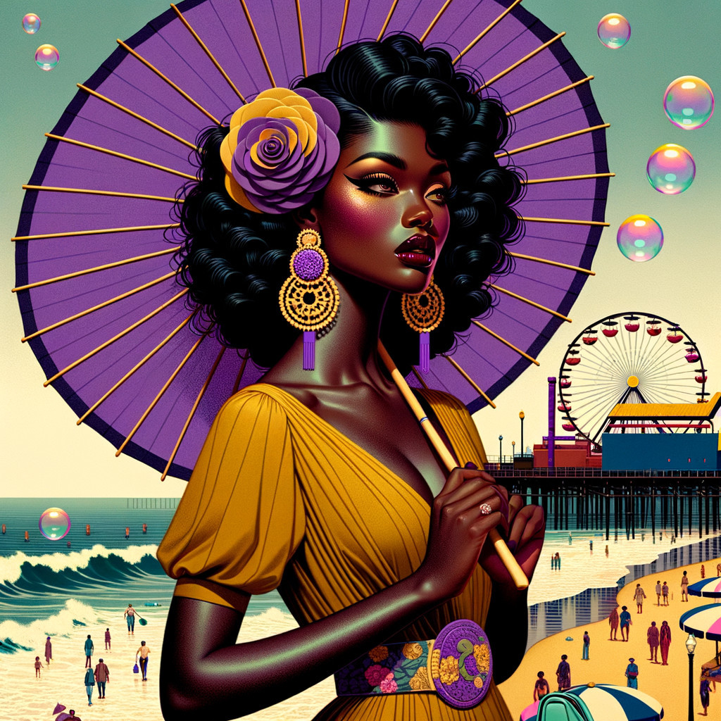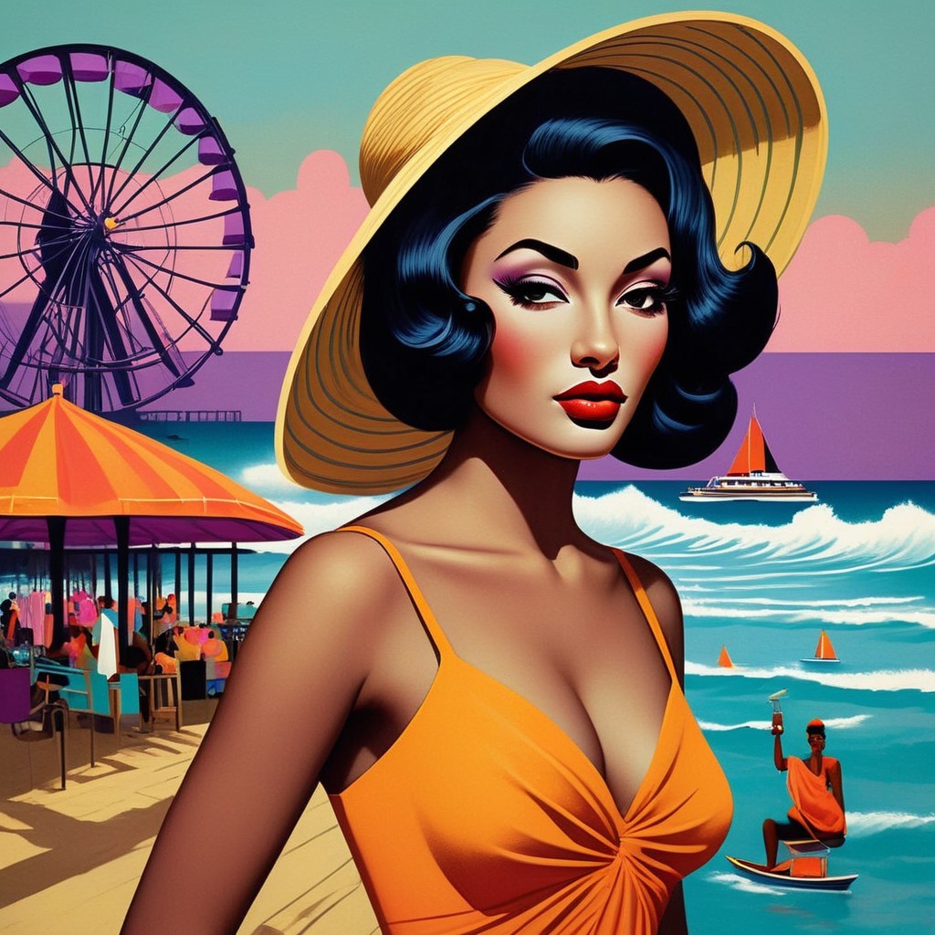 A stylized illustration of a woman in a vintage blue swimsuit and sun hat with beach umbrellas and a coastal scene in the background.