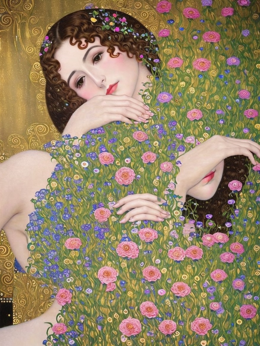 A painting of a woman with closed eyes, wearing an ornate, blue and gold dress, poised elegantly against a moon and starry backdrop.