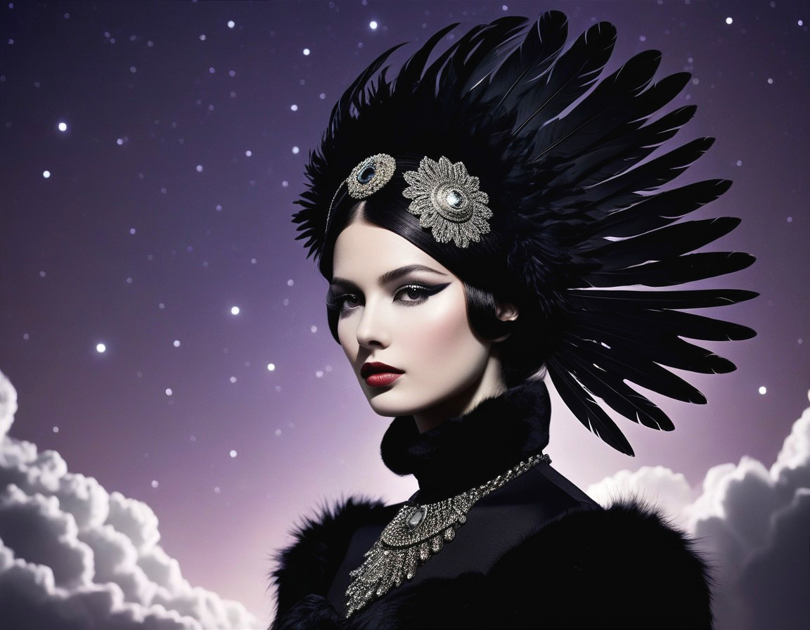 (Try from EssentiallyRei) - A striking portrait of a woman adorned in an elaborate black feather headdress, exuding elegance. Her makeup is dramatic, set against a starry night sky with soft clouds.