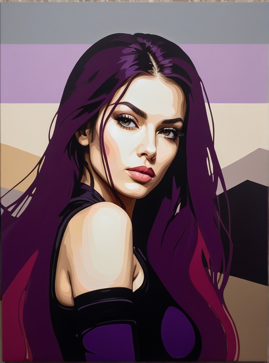 A striking portrait of a woman with long, flowing hair and captivating features. She gazes confidently, set against a backdrop of muted colors that enhance her bold expression.
