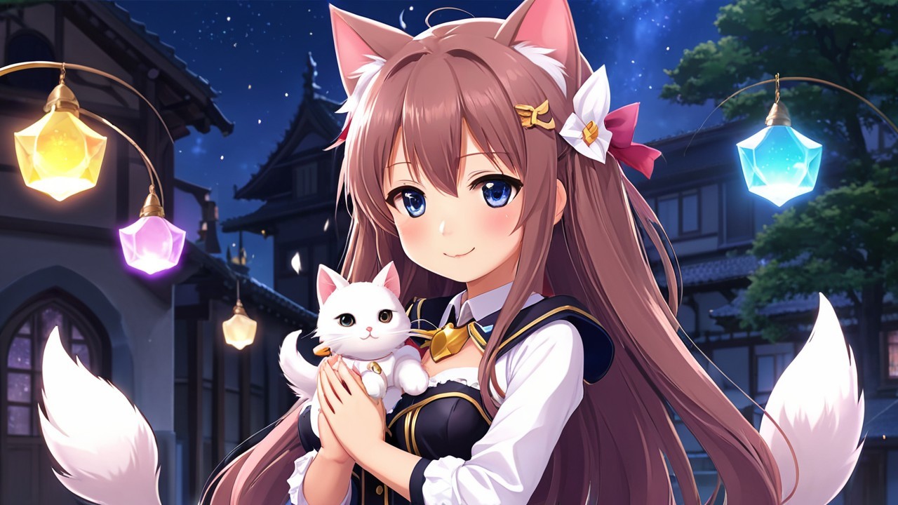 A charming magical catgirl with adorable features and playful demeanor uses her enchanting powers to protect her friends and the world around her, blending whimsy with bravery in every adventure.