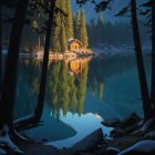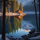 A cozy log cabin sits by a tranquil, reflective lake surrounded by tall pine trees. Snow-capped mountains rise in the background, creating a serene winter landscape.