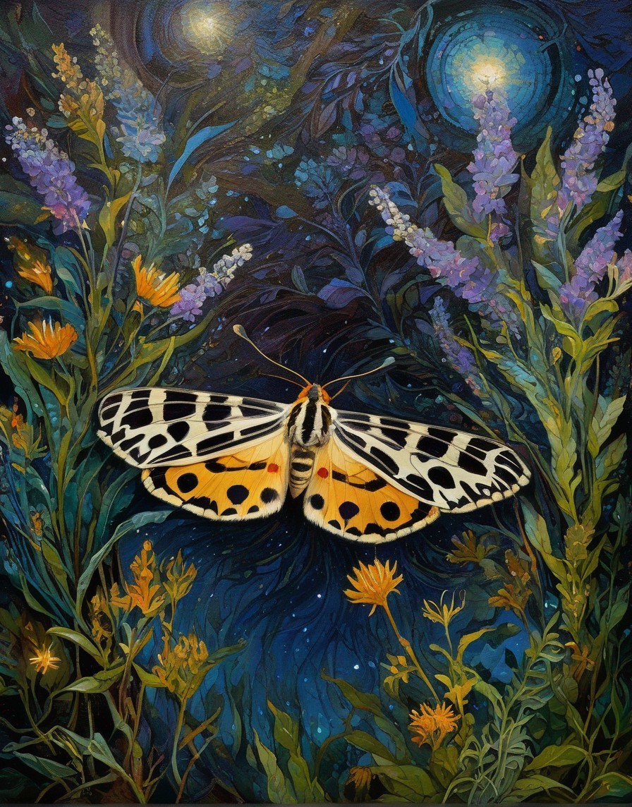 A vibrant painting of a harnessed tiger moth with a cosmic backdrop, surrounded by colorful flowers under a starry night sky this image was started with a seed image of one of my paintings, which helped me complete it)