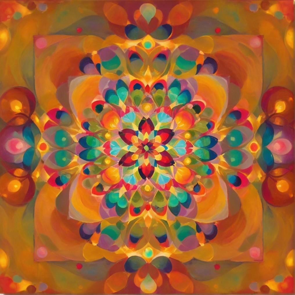 A vibrant abstract artwork featuring a symmetrical arrangement of colorful circles in warm shades of orange, teal, and purple, creating a lively, dynamic visual pattern on a soft background.
