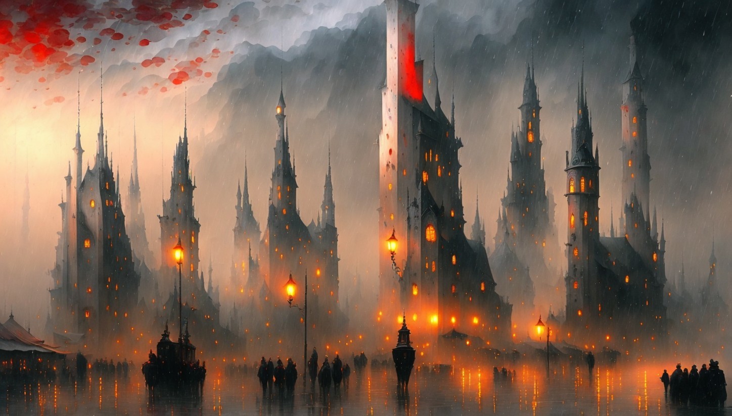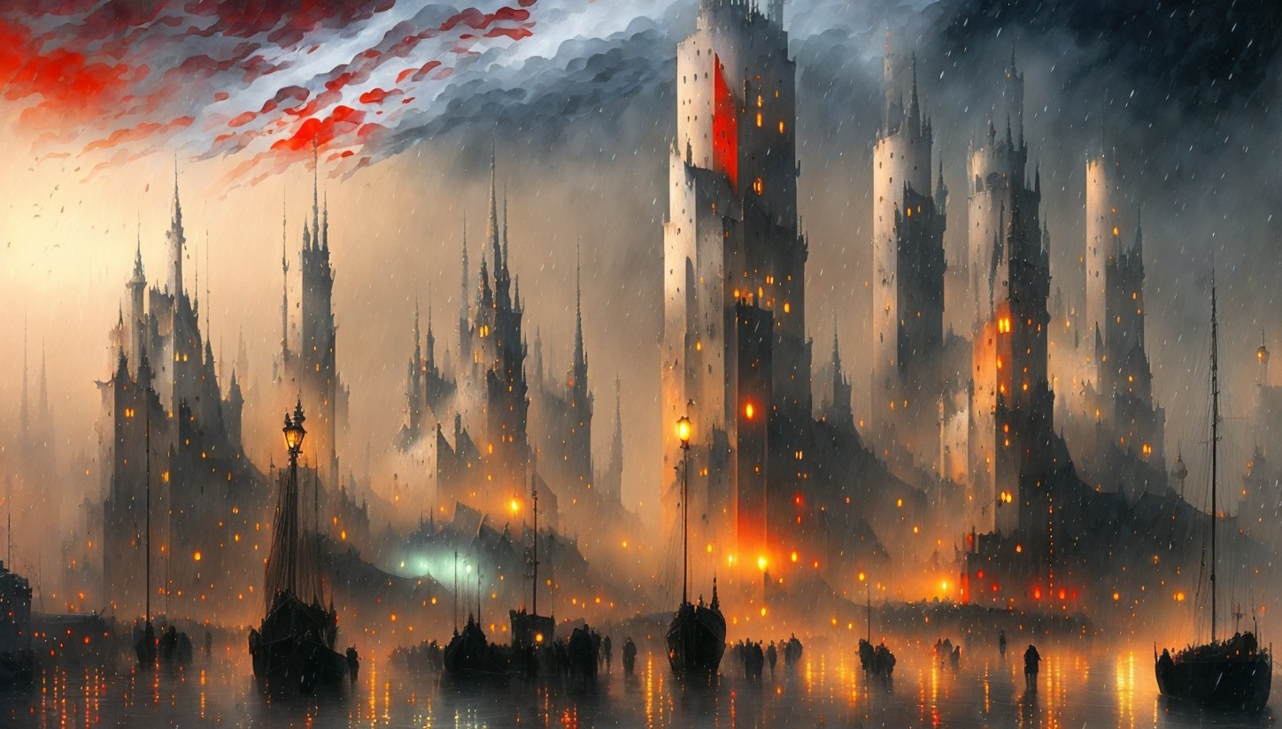 + Prompt:a town with mist and smoke, dark gray color, red lights, hard rain, and watercolor patchwork by Picasso and Caspar David Friedrich and Daniel Merriam