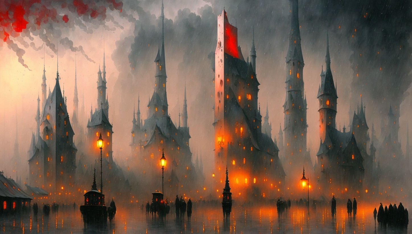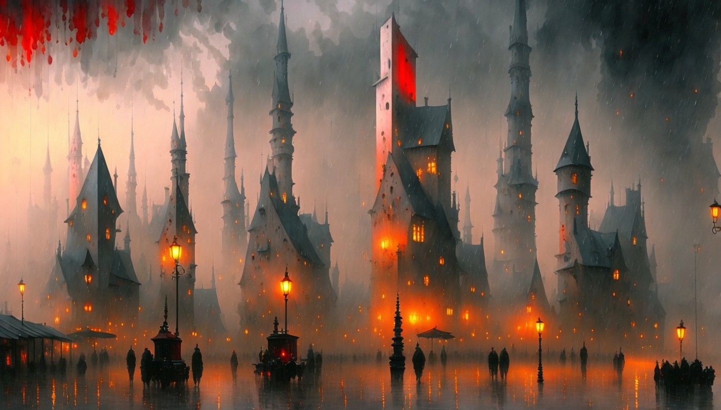a town with mist and smoke, dark gray color, red lights, hard rain, and watercolor patchwork by Picasso and Caspar David Friedrich and Daniel Merriam