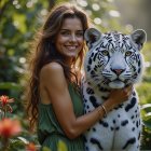A smiling young woman with long, curly brown hair and a green dress is crouching next to a white tiger with dark stripes and yellow eyes in a lush jungle setting. The woman is gently touching the tiger’s chin with her right hand, which has a thin gold bracelet on the wrist. The tiger