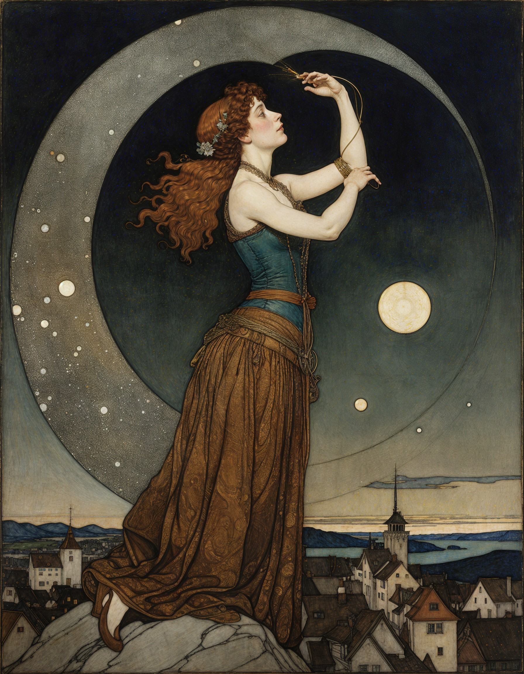 An elegant woman sits gracefully, entwined in flowing fabrics against a circular backdrop. She holds delicate strands while a glowing moon illuminates the scene, blending natural beauty with ethereal charm.